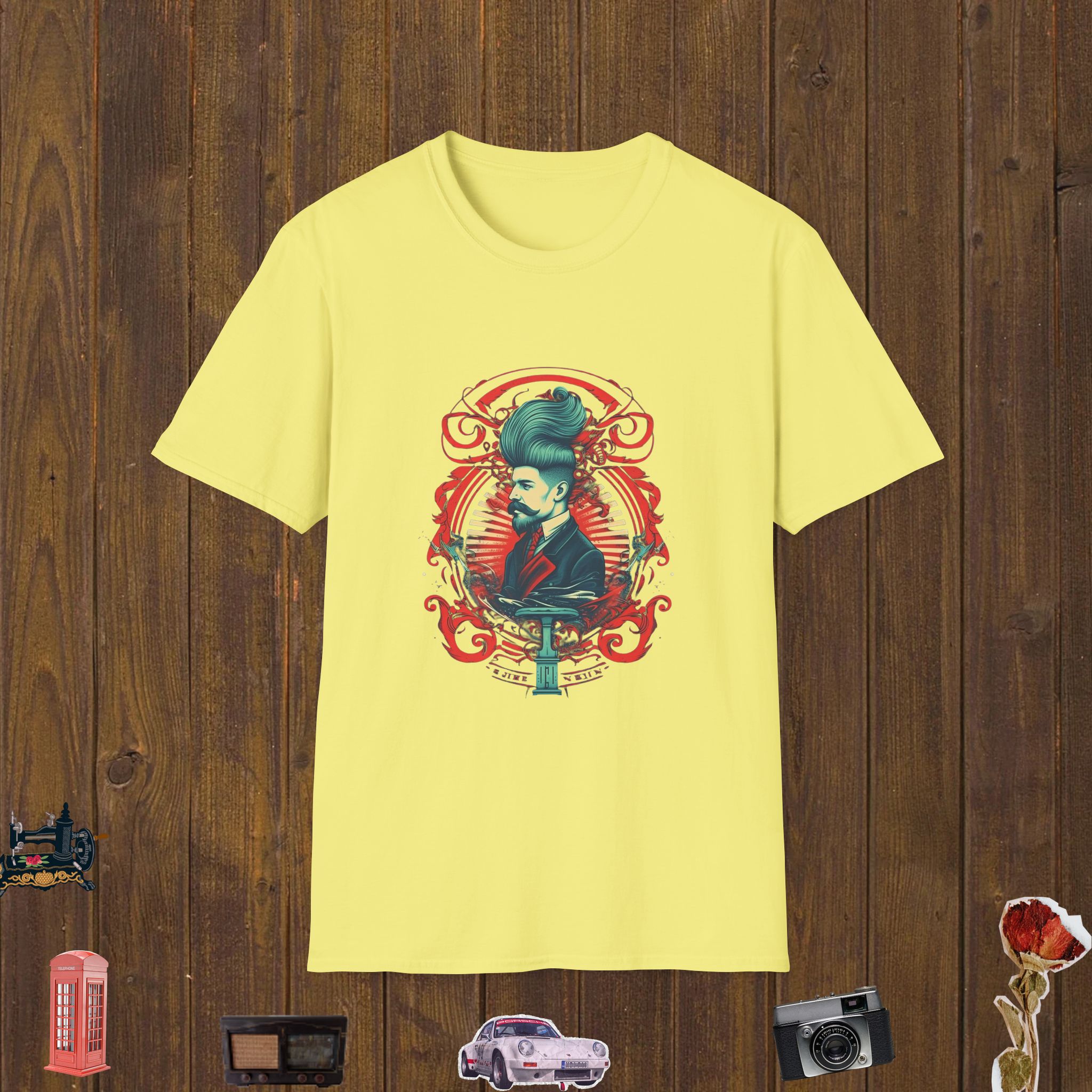 This T-shirt showcases a flamboyant, vintage-style portrait of a sharply groomed gentleman with an impossibly tall, styled pompadour and a sleek suit. Surrounded by swirling red and teal baroque patterns, traditional barber tools and a barber pole base anchor the piece in classic barbershop heritage. The backdrop features radiant sunburst lines and ornamental detailing that gives this design a dramatic, tattoo-art-meets-victorian-barber-shop vibe. This artwork is an absolute statement for lovers of retro grooming culture, modern barbers, or anyone bold enough to wear iconic flair with pride.