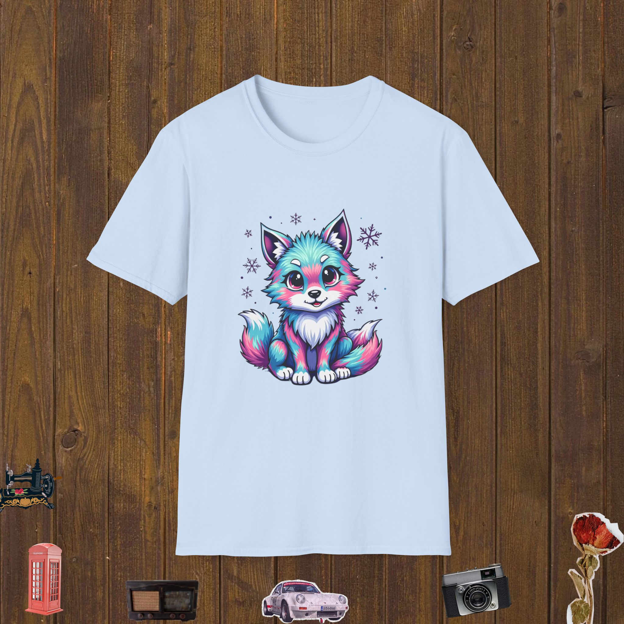 This T-shirt showcases an irresistibly adorable, vintage-style illustration of a pastel-colored baby wolf with big, shining eyes and a joyful expression. The little wolf is painted in eye-catching shades of pink, teal, and purple, sitting sweetly surrounded by snowflakes in a whimsical winter scene. Its playful design radiates charm and personality, making it a perfect choice for those who love colorful, kawaii-inspired art with a seasonal twist. The retro color tones and soft outlines give it a nostalgic, yet modern aesthetic that will turn heads and warm hearts.