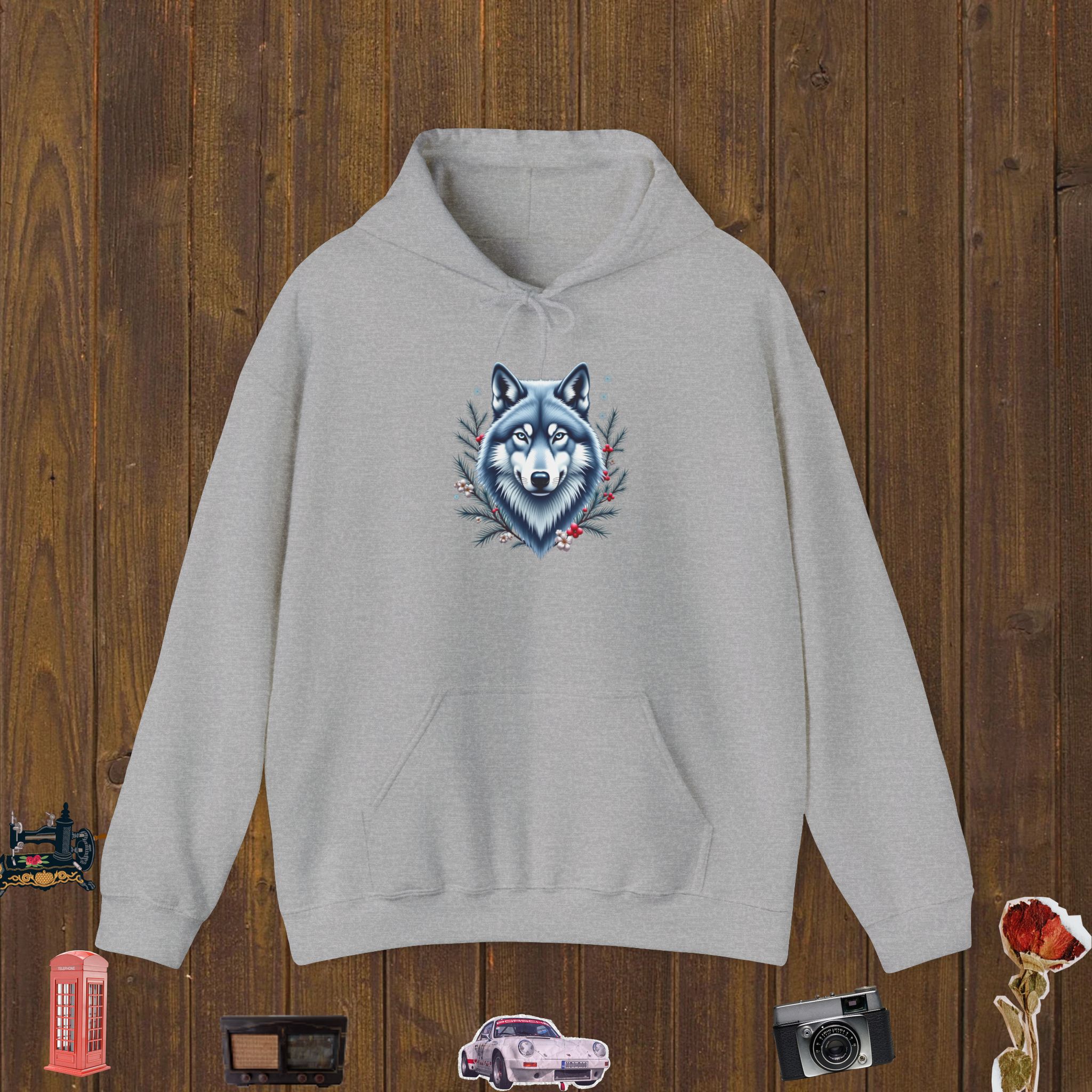 This vintage-style hoodie showcases the powerful gaze of a majestic wolf framed by an elegant wreath of pine branches, red berries, snowflakes, and soft winter flowers. The wolf’s thick, silvery-blue fur contrasts beautifully against the botanical details, creating a design that feels both fierce and graceful. The symmetrical composition and wintry color palette give it a timeless, artistic look — perfect for nature lovers and those drawn to the quiet strength of the wild. The artwork captures a moment of calm majesty, blending natural wilderness with seasonal charm.