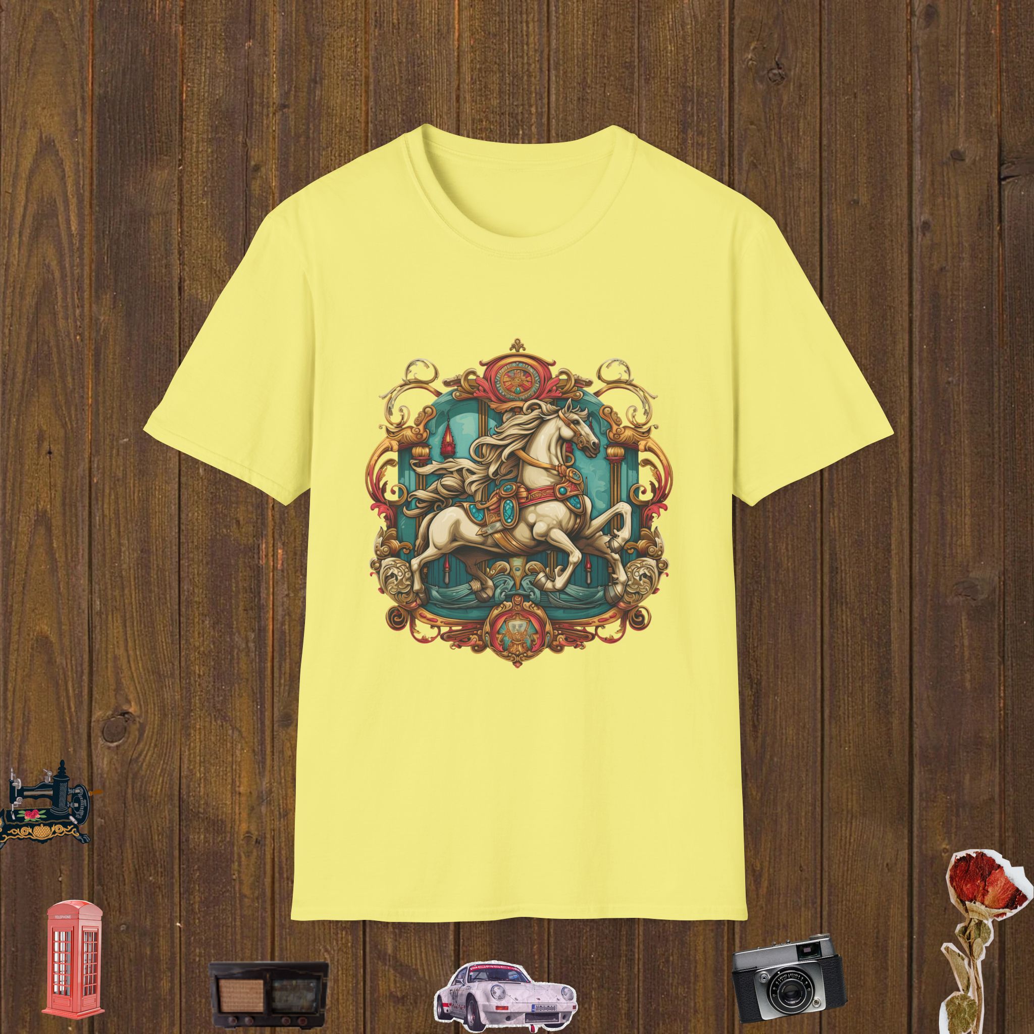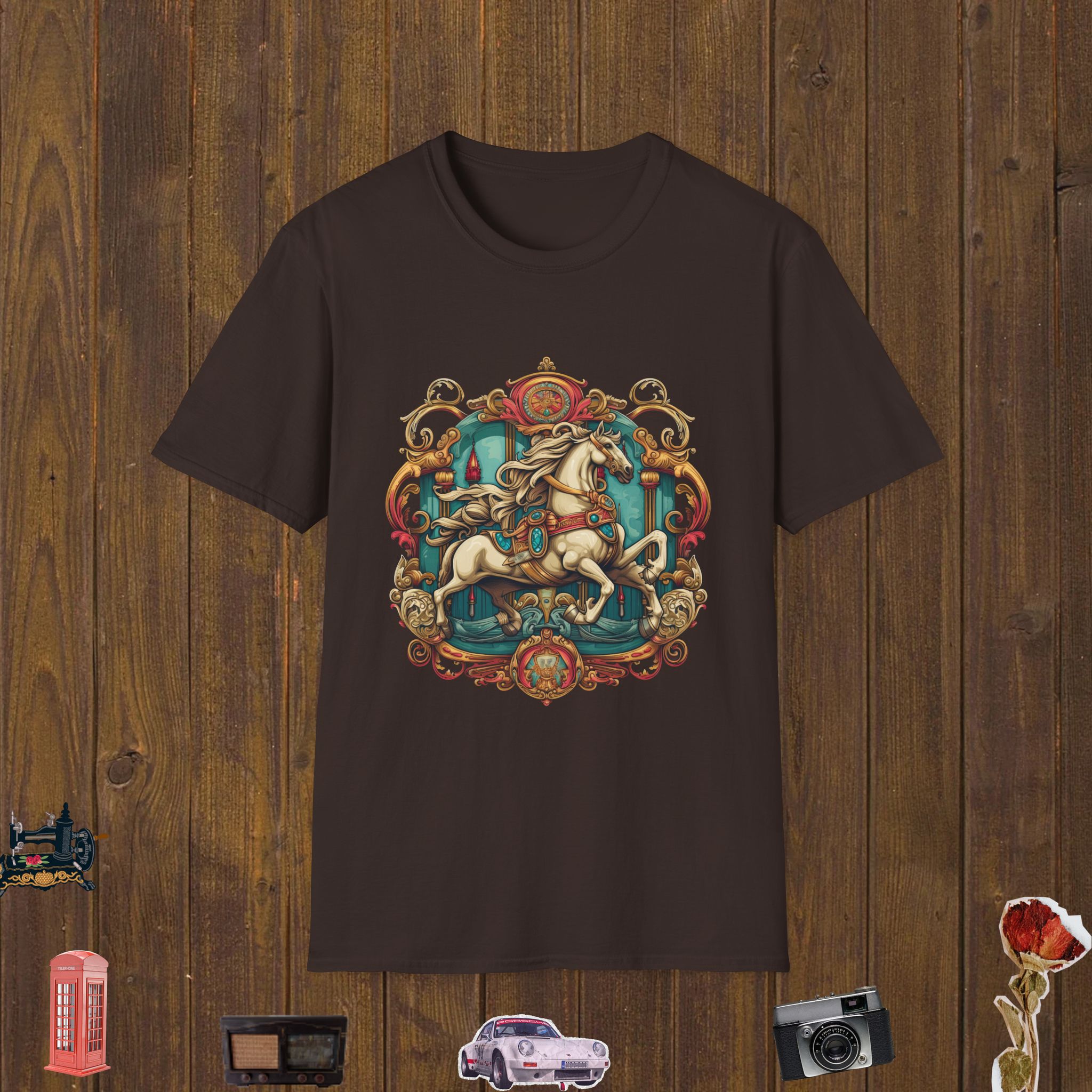 This vintage-style T-shirt presents a magnificent white carousel horse mid-gallop, adorned with ornate golden and turquoise trappings. Set against a lavish baroque frame in jewel-toned reds, blues, and golds, the horse is surrounded by intricate scrollwork and classical motifs that evoke the opulence of 19th-century fairgrounds. The design feels like a regal relic from an antique carousel, combining elegance and energy with a nostalgic twist. It’s the perfect wearable artwork for lovers of classic amusement park aesthetics, Victorian design, or timeless equestrian beauty.