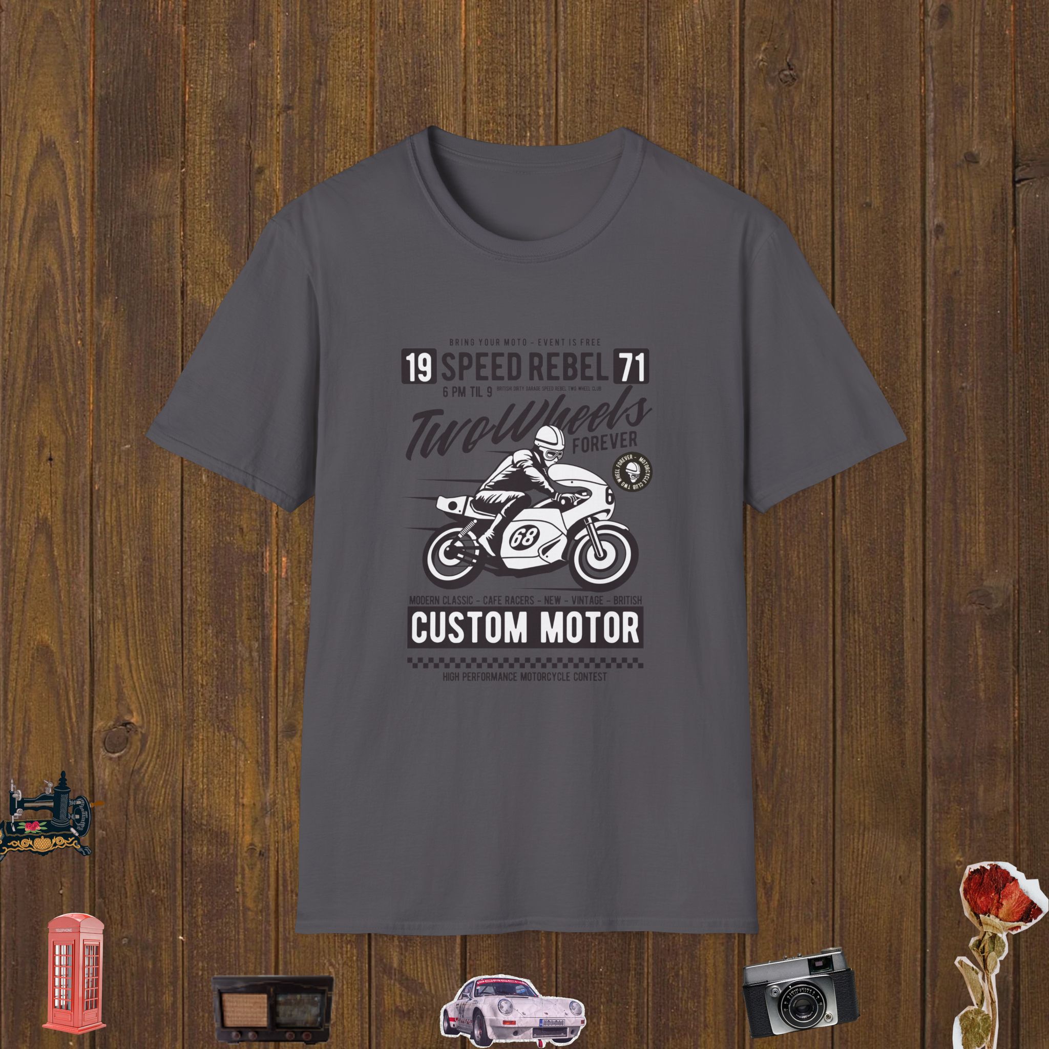 This vintage-style T-shirt showcases a dynamic illustration of a speed racer mid-turn on a café-style motorcycle, wearing full gear and numbered “68.” Surrounding the rider are bold slogans like “Speed Rebel,” “Two Wheels Forever,” and “Custom Motor,” evoking the energy of underground racing clubs and British café racer culture. The monochrome palette and retro typography give the design a gritty, authentic garage-race vibe, perfect for motorheads and rebels alike.